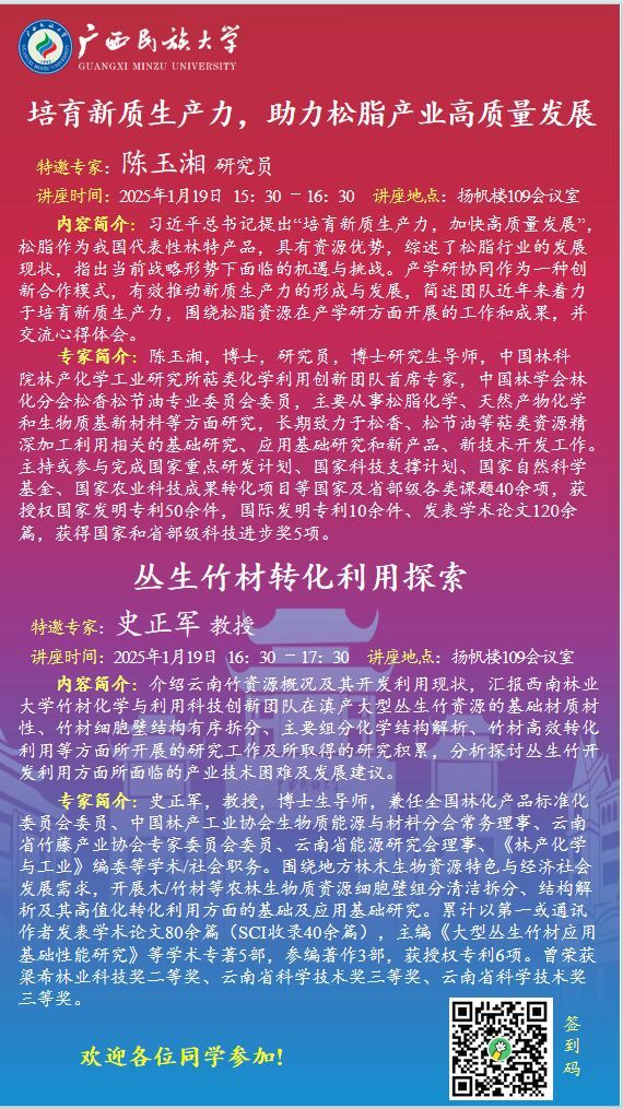 上一条:中国林业科学研究院林产化学工业研究所陈玉湘研究员应邀来我院开展学术讲座 下一条:浙江工业大学纪红兵教授应邀来我院开展学术讲座